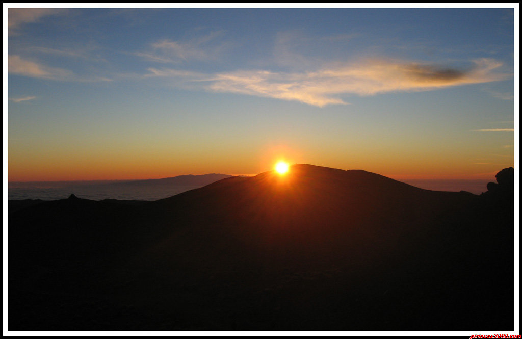 En mi caso particular, quedé a las 6 a.m. con Fran Glez. para subir al Pico desde Montaña Blanca. Al final salimos con un poquito de retraso y con una brisa que tiraba pa'tras. Subimos al trotillo por la pista de Montaña Blanca, la muy jodida se me resiste y no consigo hacerla corriendo del tirón, algún día caerá. Iba notando el no haber desayunado nada, pero el palique con Fran hacía callar el estómago; y así, hablando y hablando y casi sin darnos cuenta estábamos en el refugio. Aquí hicimos una paradita para comer algo, ¡al fin!, y sacar una foto, -mierda- la cámara no tiene pilas y había un amanecer precioso. Pues nada, mochila a la espalda de nuevo y empieza la parte más dura, aquí Fran y yo nos quedamos mudos y no volvemos a hablar hasta ya cerca de la Rambleta del Teleférico, el poco oxígeno que nos entraba en los pulmones lo necesitábamos para las piernas.